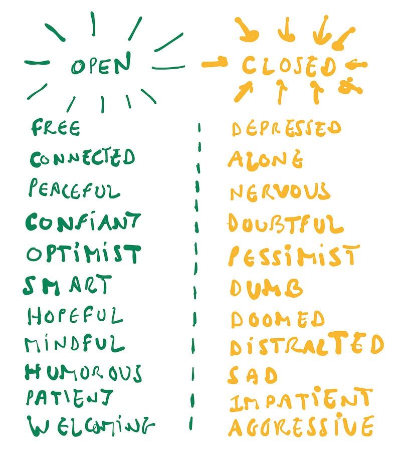 Closed is a feeling we have when our self feels threatened. It is a feeling designed to protect us from danger. We have three basic modes of survival: fight/flight/freeze.